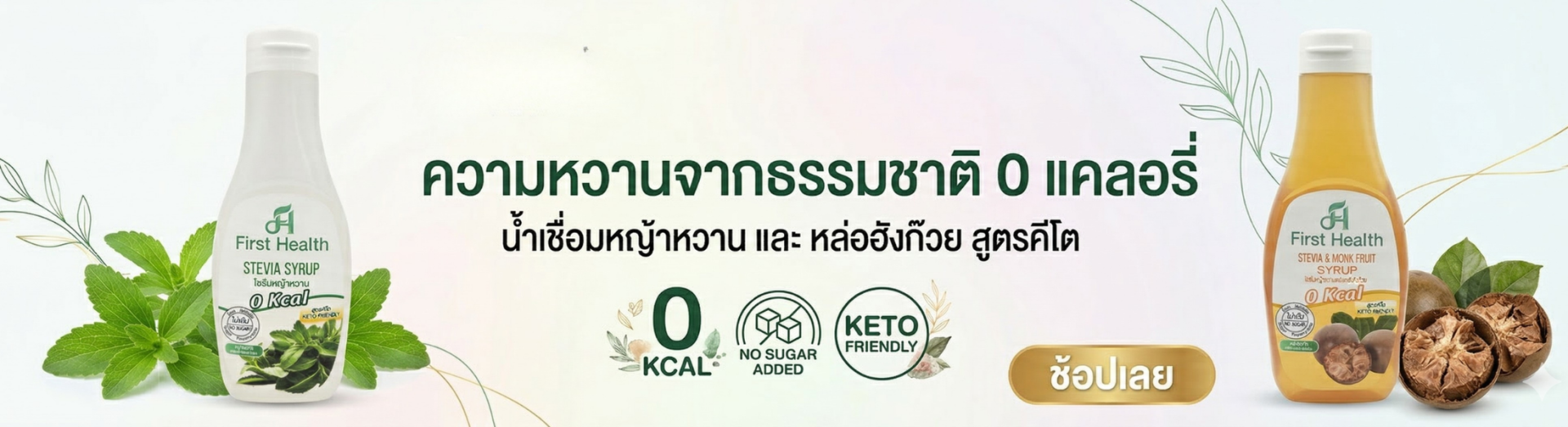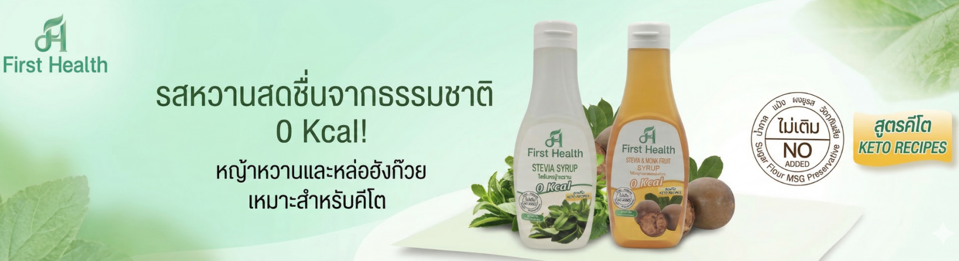 น้ำเชื่อมจากหญ้าหวาน สำหรับคนรักสุขภาพ มีหญ้าหวาน และน้ำตาลหล่อฮังก๊วยเป็นสารให้ความหวานแทนน้ำตาล